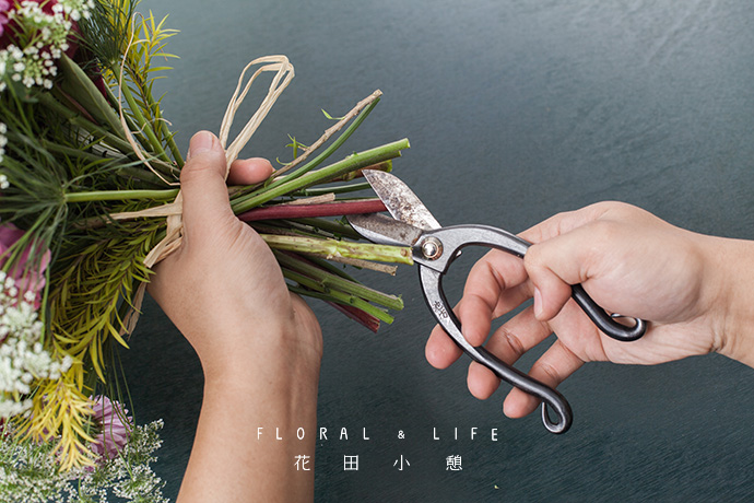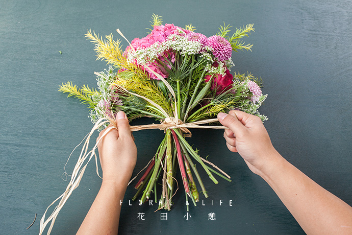 花材的选择是极为重要的,通过不同花材的组合,能提升作品的新鲜感. 增加3-5支白色的蕾丝花增添花材种类和色彩,再用拉菲草进行捆扎,使作品整体生动多样而富有变化。