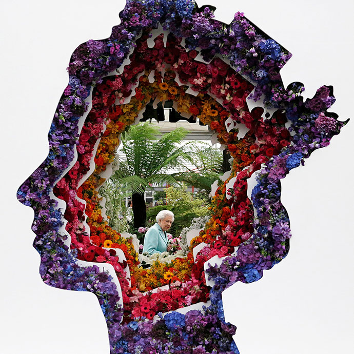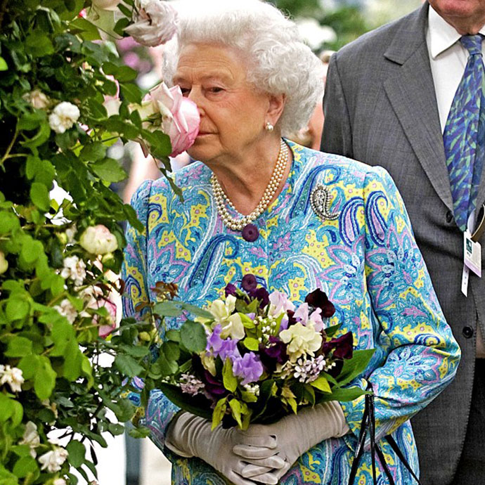 一年一度的切尔西花展(Chelsea Garden Show)是英国最盛大的传统花卉园艺展会。作为全英爱花人的表率,当然要身体力行为国家代言。今年切尔西花展也正值女王90岁官方生日。因此就有了这款轰炸网络的著名花艺作品。