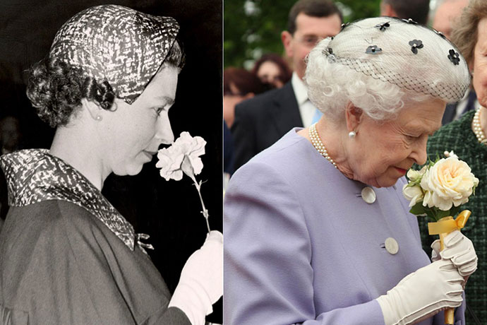 随着年纪的增长,女王的全花帽子慢慢演变成了套装帽子上的花朵装饰。