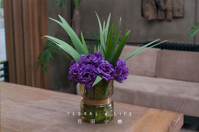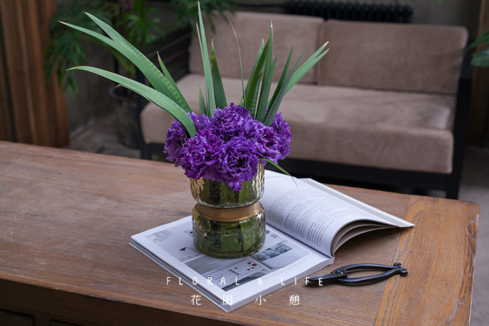 1.作品以紫色龙胆为基础色彩,并通过绿色鸢尾的点缀,形成强烈的色彩对比。将作品放于庭院之中,让温馨的质感呼之欲出,成为一道亮丽的风景。