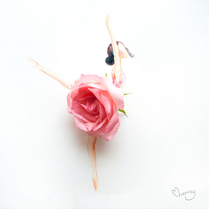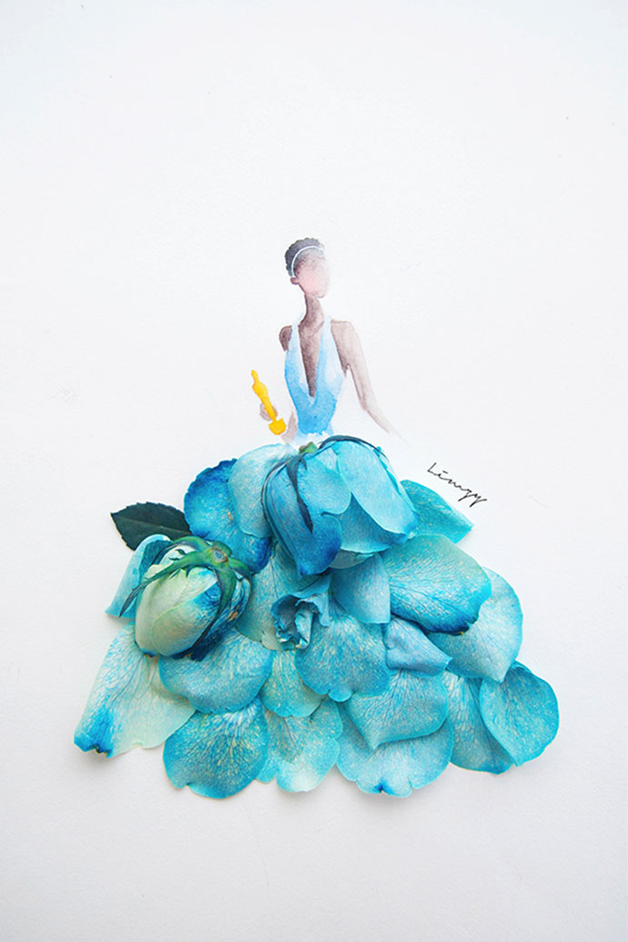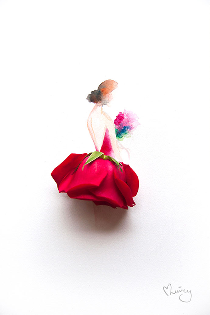 玩著玩著,就认真起来了。有一个周末,外婆的生日即将来临,我想要送她比较特别的东西,但也没什麼主意,就在她的院子裡溜达,找到了一朵玫瑰花。我摘了下来,把它夹在词典里押干。当时看了压扁的花瓣,我觉得还挺像女生的蓬蓬裙,便创作了第一幅花画送给外婆(下图)。
