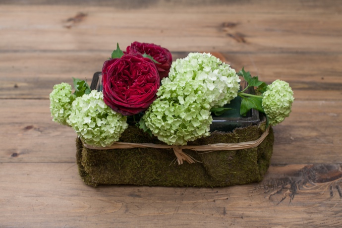 花艺制作时可从观赏性进行入手,通过以多彩的精心搭配,呈现出不一样的风格和特质。比如:以木绣球作为辅助花材插制于奥斯汀玫瑰两侧,以延伸之势丰满作品,可保持作品良好的视觉平衡性。而