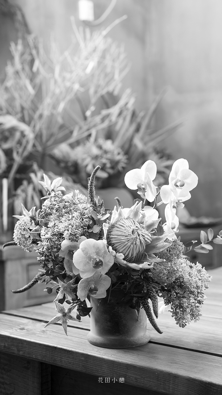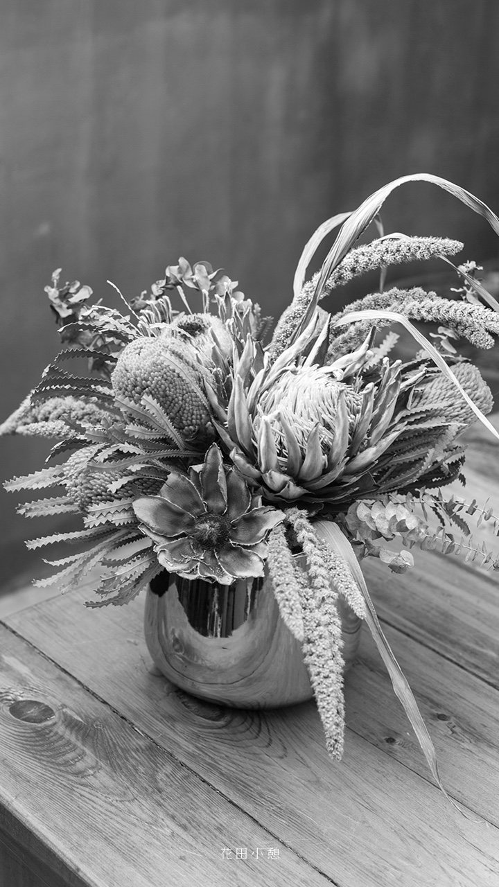 将不同的干燥花聚合在一起,动手插制成恬淡的自然风景. 帝王花有着容易保存的特性,搭配的尤加利拉出优美的线条,像是家居环境中经久不变的守候,始终营造着温馨的感觉。