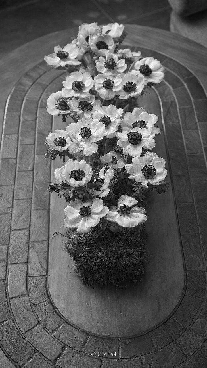 素雅的银莲花并排依偎,插制于满是自然意味的苔藓之中,洋溢着春日的美好气息. 繁茂的银莲花置于庭中一角,像是家居环境中曼妙的景色,添一抹淡雅,等一轮春。