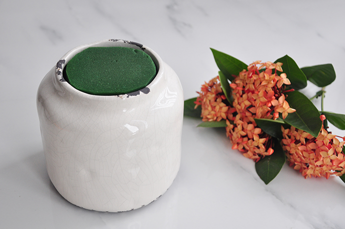 如果花朵的枝条够长,可以直接采用水养瓶插,反之则需要使用花泥。家养的植物枝条一般无法达到鲜切花的长度,所以小意达这里用了一个矮胖的花器,并且使用了花泥。