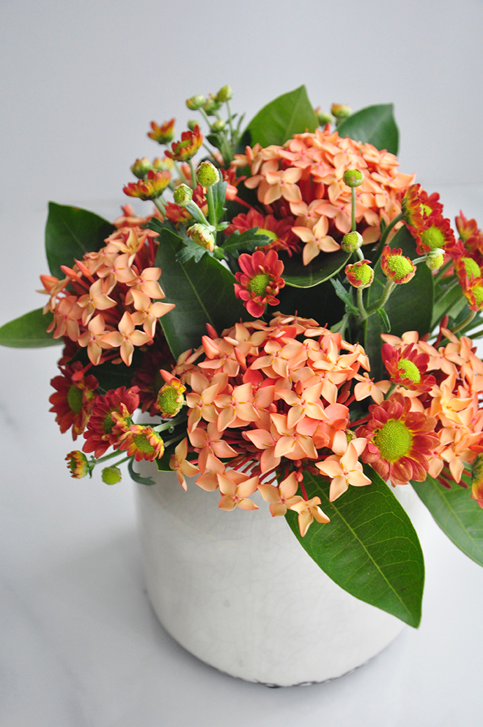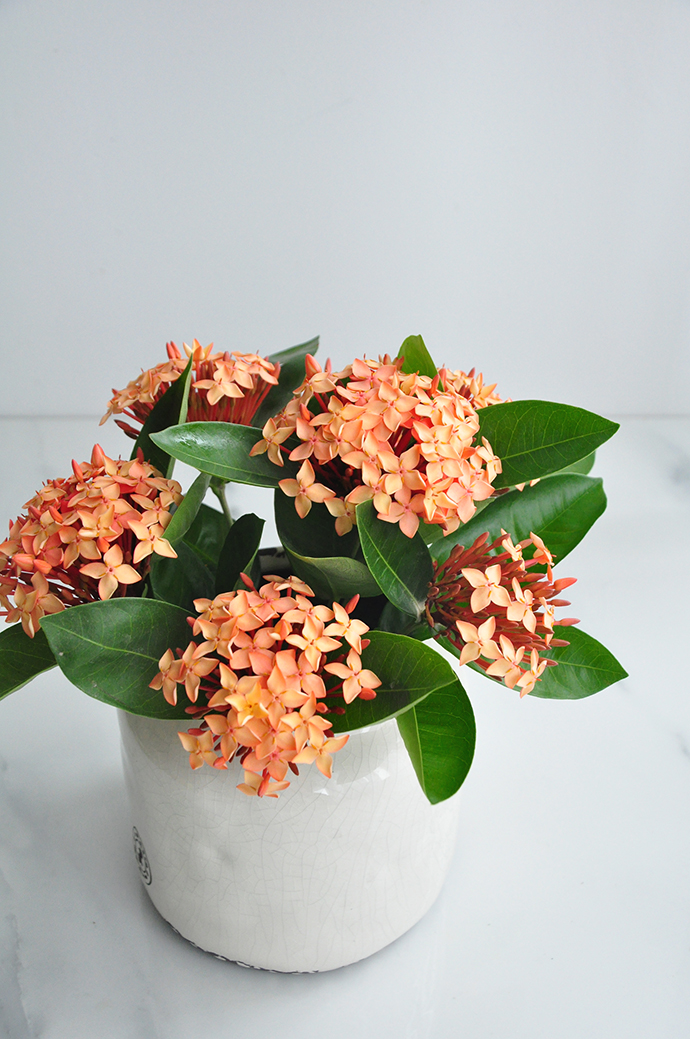 入秋,小意达去花卉市场买了一盆龙船花,到现在开了第一茬花,明亮的橘色在日渐萧瑟的秋风里让人格外暖心。于是小意达把这些花剪下来做成一个小小的花艺摆设。