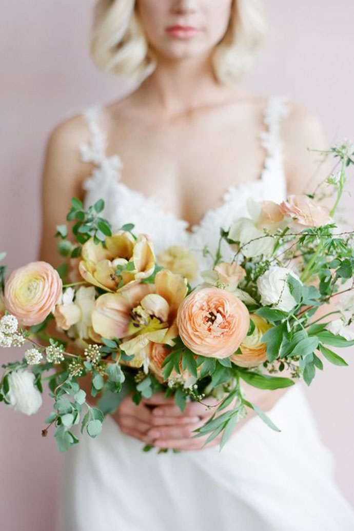 这种一种圆形花束,体积不大,带用有珍珠别针的缎子和丝带将花材的根茎包裹好。由于体型不大,新娘正好可以一只手拿,还方便将捧花抛出去。