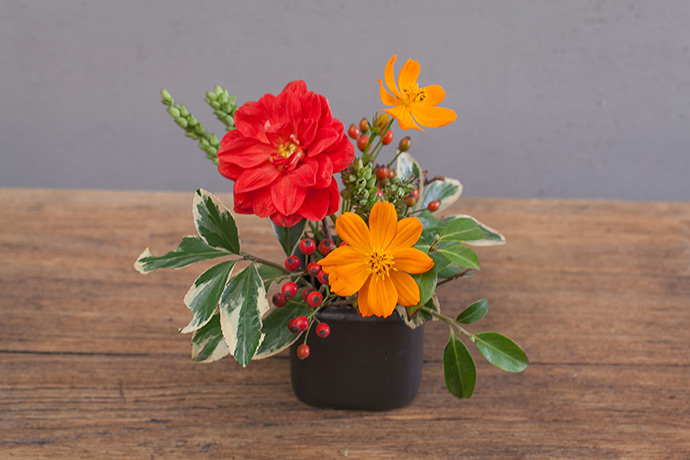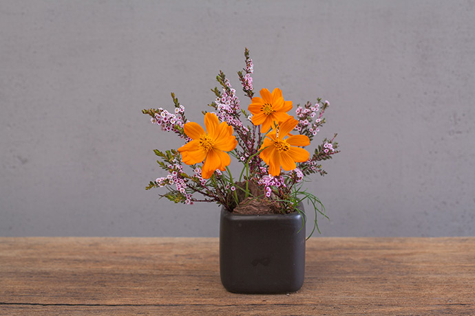 其实在土里插花有一些小难度,就在于浇水的时候,密度会突然的发生很大的变化,从而造成造型中的花儿的角度会有一些偏差。