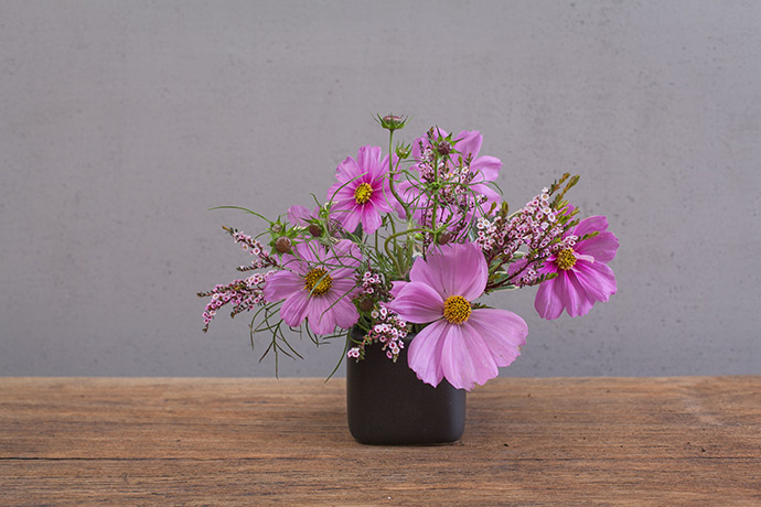 把花儿按照喜好插入木棍的缝隙中,不仅可以固定而且供水空间也充足。