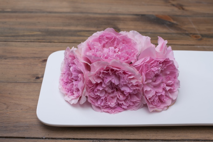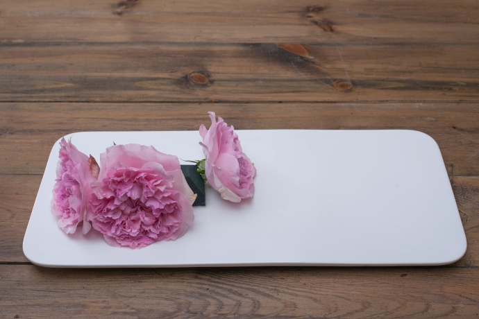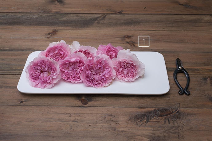 合理地搭配材料,使花材与花器融为一体。纯色花器一般选择明亮的花材进行搭配,以“对比色组合”的方式加以呈现。奥斯汀玫瑰被誉为“