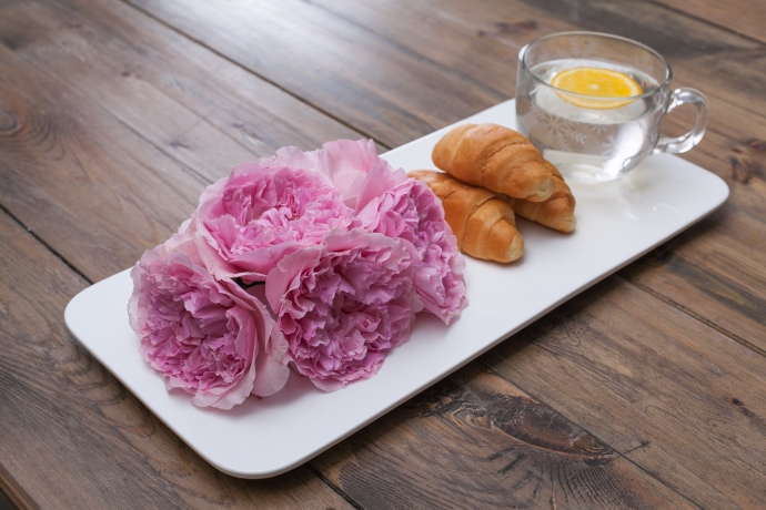 在作品的右侧摆放香酥可口的面包,配上一杯清爽的柠檬茶,通过食物与花的搭配,让作品的画面更加“爽朗可口”。