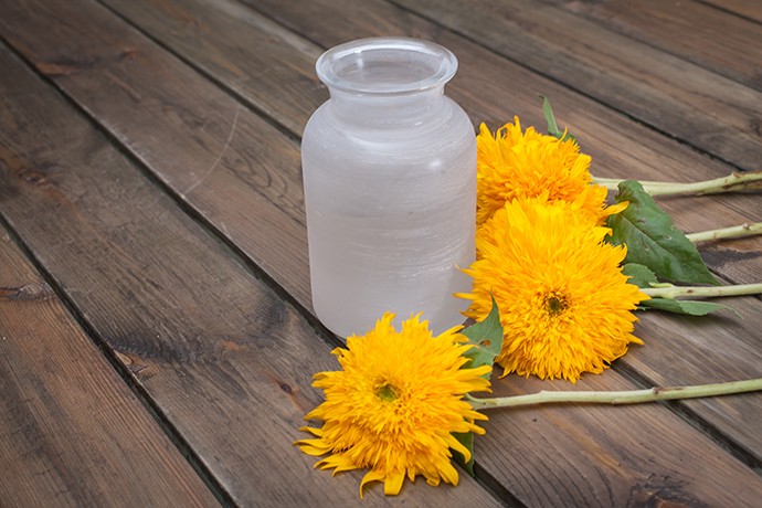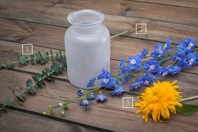 花盘较大的向日葵稍微插低些,以保持整体的和谐,花茎在花瓶中呈十字交叉。