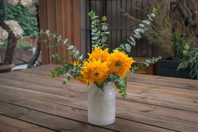 圆叶尤加利具有自然弯曲的动态之美,将其随意插制在向日葵的周围,保持花材间均衡、稳定的关系。