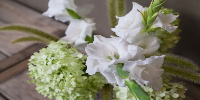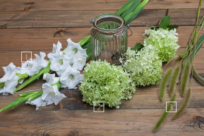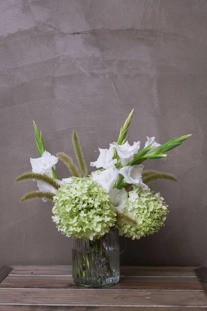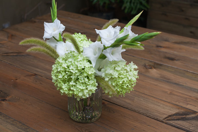 将处理好的唐菖蒲插入圆锥绣球之间,散落分布。为了使作品更加丰富饱满,将狗尾草插入花儿之间的空隙中。毛茸茸的狗尾草,给这幅宁静淡雅的作品中添加了一份生机勃勃之感。
