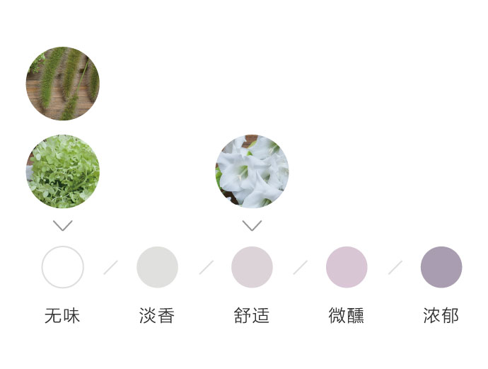 为了方便大家在花材搭配时的选择,花田小憩特设香味等级图谱,供大家在学习过程中了解更多植物的属性,以方便作品选择更适合的空间位置陈列。
