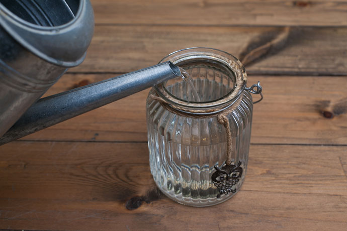 取一个透明的玻璃瓶,向其中加入约2/3左右的水。在夏季,天气炎热,花儿对水量的要求较高。