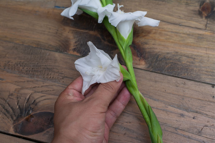 去掉唐菖蒲花枝中有败落迹象的花朵。唐菖蒲是由下至上开花,往往下面的花儿还未落,上面的花儿已经绽放。