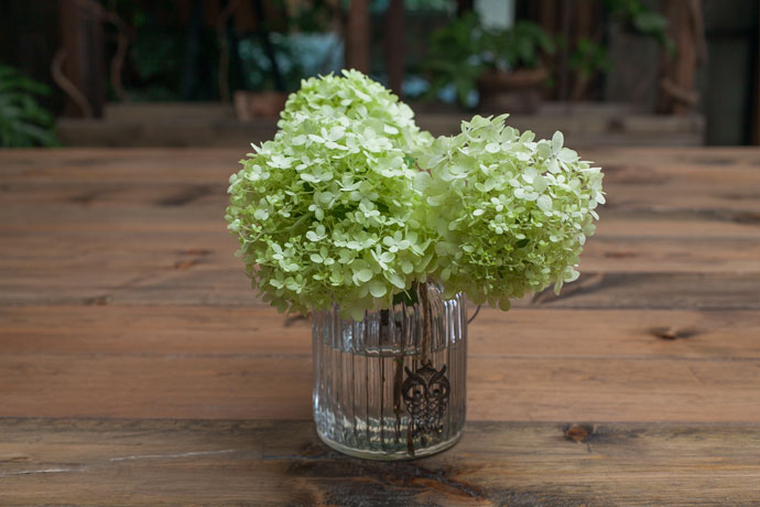 将3支圆锥绣球依次摆入花器中,分别朝向三个不同的方向,营造蓬勃的视觉感受。