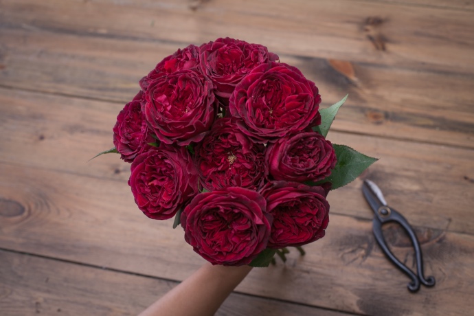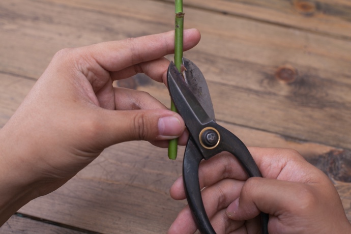 植物的自身有着天然的保护色,像根茎、枝叶、刺都具有着各自的功能. 奥斯汀玫瑰的花刺锋锐有力,可根据作品的需要,选用专业的花艺剪,将奥斯汀玫瑰根茎部位的花刺进行处理,修剪时防止花刺刮伤手指,同时避免损坏花枝的原有形态,让整洁大方的质感呼之欲出。