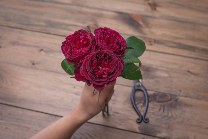 将处理好的奥斯汀玫瑰,以3朵相依偎的形式,形成一个稳定构图的“三角形”,作为花束的中心。而保持根茎部分有少量的枝叶,令作品造型更具有大自然的韵味。