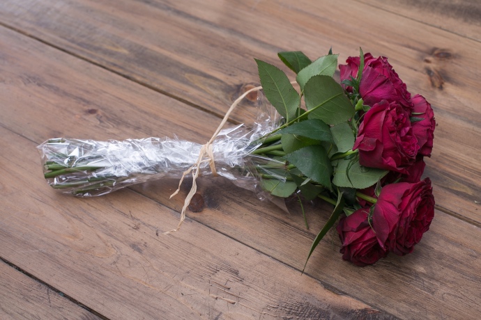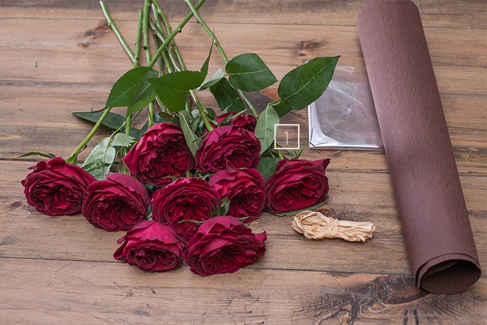 稳固之态能让花枝更好的展现“姿色”,可选用一张干净透明的玻璃纸,将花束茎干部分进行适当的包裹,再用拉菲草进行缠绕捆扎,保证作品整体的稳固程度,展现出花材挺直的线条美感。