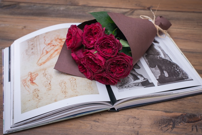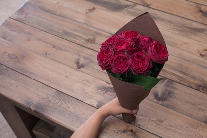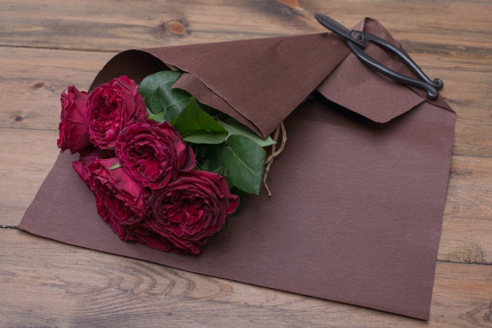 在作品搭配中,奥斯汀玫瑰具有生机、热情的含义,根据作品的大小,裁剪适当尺寸的卡纸进行包装。深色的卡纸与红色的玫瑰进行搭配,形成舒适的色彩对比,突显出作品雅致恬淡的质感。