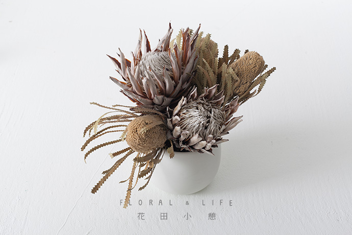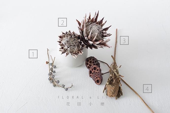 - 作品配色 -1.本次作品中,形态各异的干燥花拥有相当独特的质感,巧妙地传达出清雅的氛围。