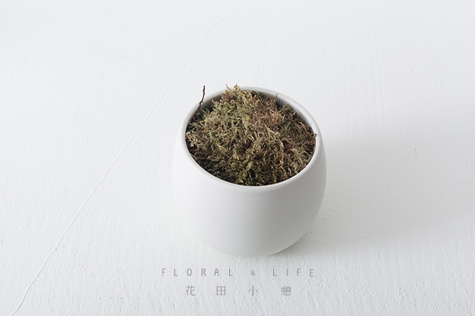 在作品创作前,确定花枝与容器间的合适比例,再把干燥的苔藓平放于花泥上方,保持花材与容器口的持平,便与花材的插制。