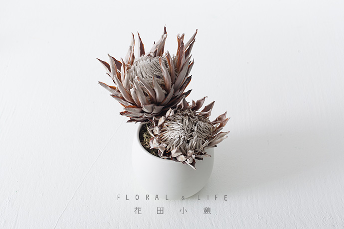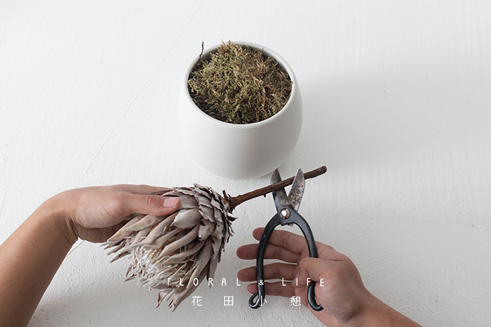 精选两支花型饱满,干燥洁净的帝王花作为主花材。花枝根部斜切45度时,保持两支帝王花“一长一短”,同时避免损坏植物的原有形状。