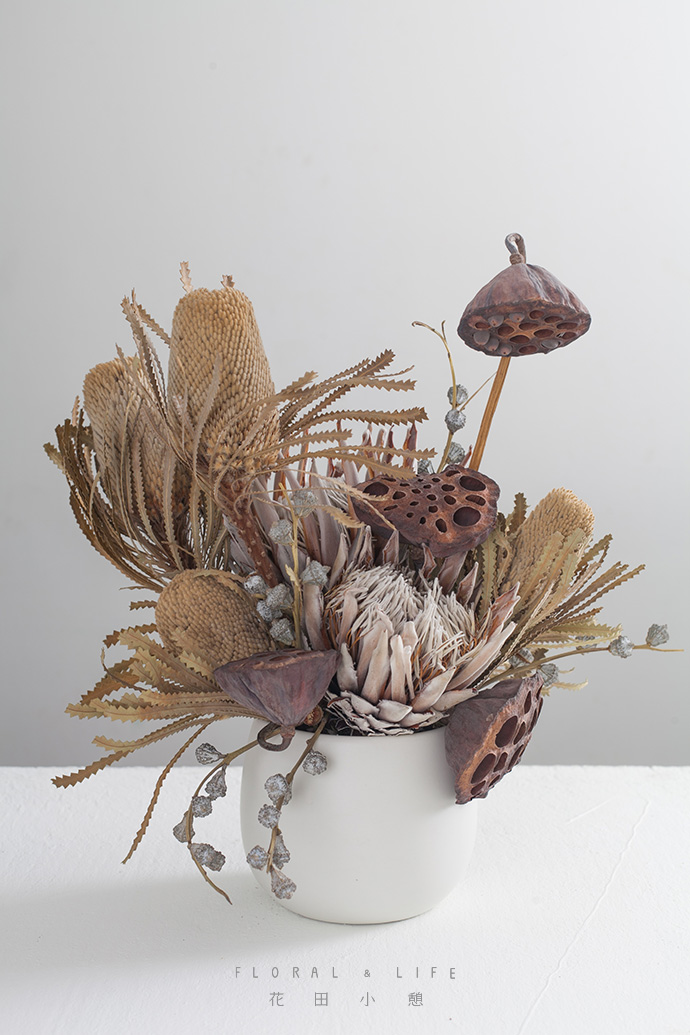 1.本次作品中,形态各异的干燥花拥有相当独特的质感,巧妙地传达出清雅的氛围。
