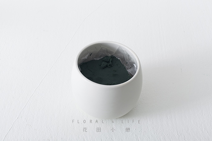 根据作品的整体配色,选择一款质地清凉、色泽明快的花器,同时将花泥处理成合适的大小放置于容器内。