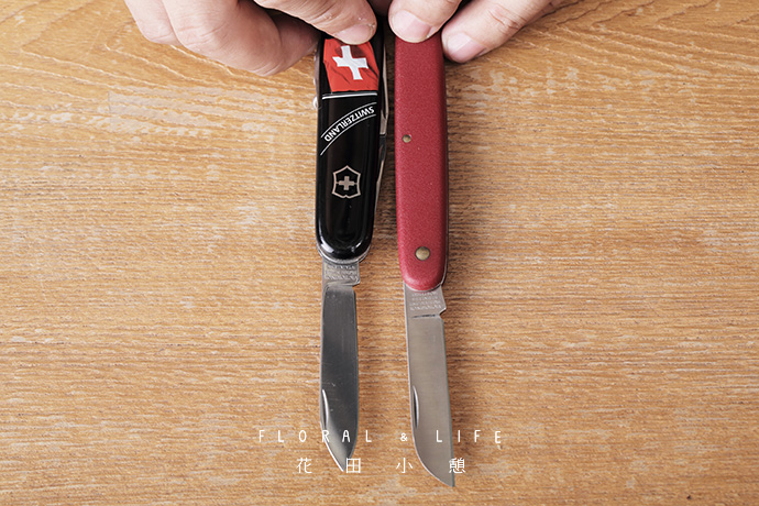 对花艺师职业的有一种特别古老的说法名为 “一刀走天下”。在很多人眼中插花应该用剪刀还是刀子是很多设计师和花艺爱好者所困惑的问题。以下为两种刀,左边黑色的是常见到瑞士军刀,右边则是瑞士产的花艺专用刀,但是两者的区别究竟是什么呢?