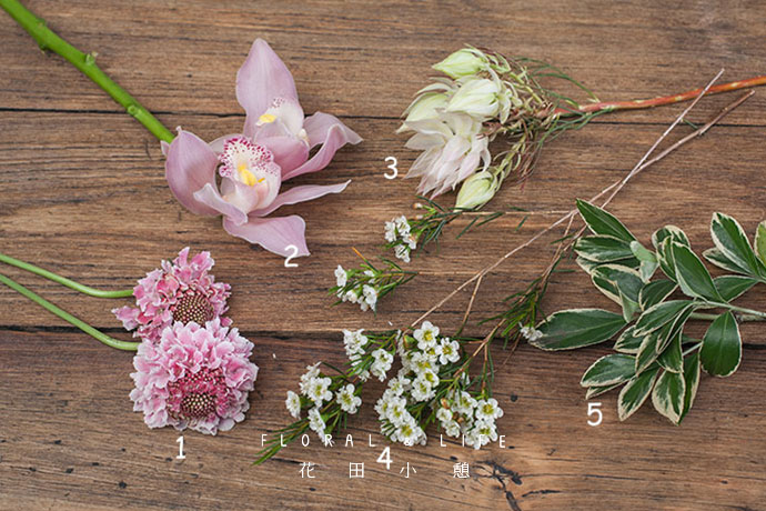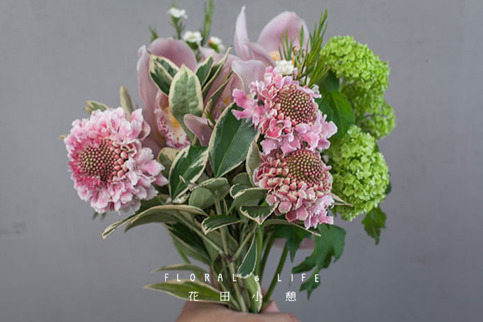 将蓝盆花搭配在黄杨四周,蓝盆花渐变的粉色与大蕙兰花的淡粉相互辉映,相得益彰。