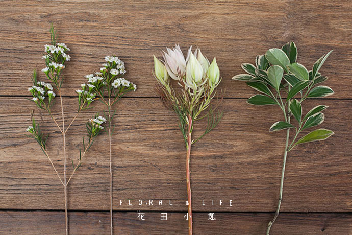 为了方便大家在花材搭配时的选择,花田小憩特设香味等级图谱,供大家在学习过程中了解更多植物的属性,以方便作品选择更适合的空间位置陈列。修剪腊梅,水晶花,黄杨下方多余枝叶。