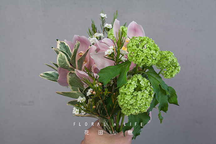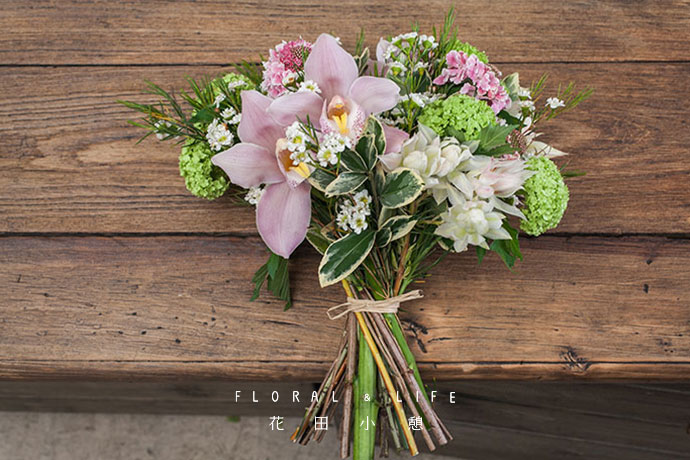 大花蕙兰搭配黄杨握于手中。