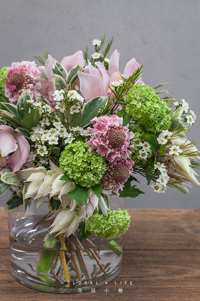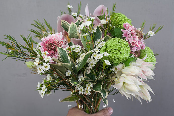 选取绿色绣球和白色腊梅,搭配在四周,使其环绕,色彩更显生动跳跃。