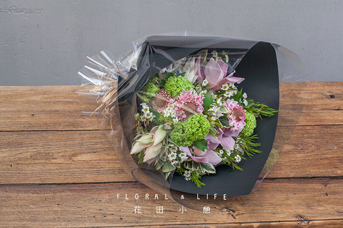 将水晶花插入花束下方一侧,不会抢主花风头,晶莹剔透的花瓣,提高了花束的整体质感。