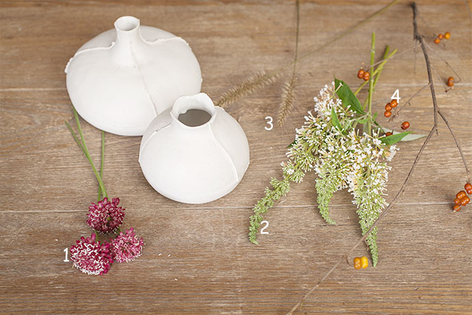 将醉鱼草和狗尾草高低错落的插入花瓶中。