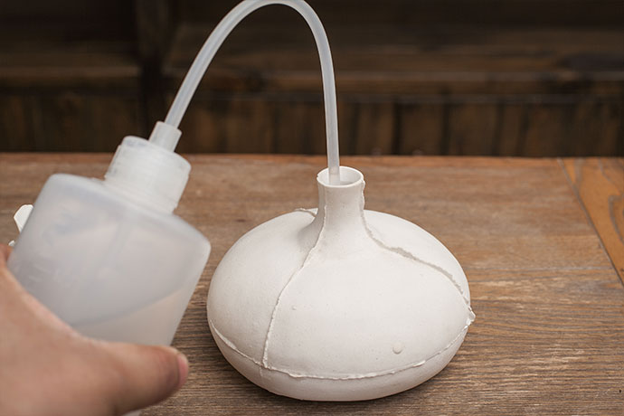 由于花瓶的瓶口较小,不易直接倒入水,可用蒸馏水瓶向花瓶中注入适量的水。
