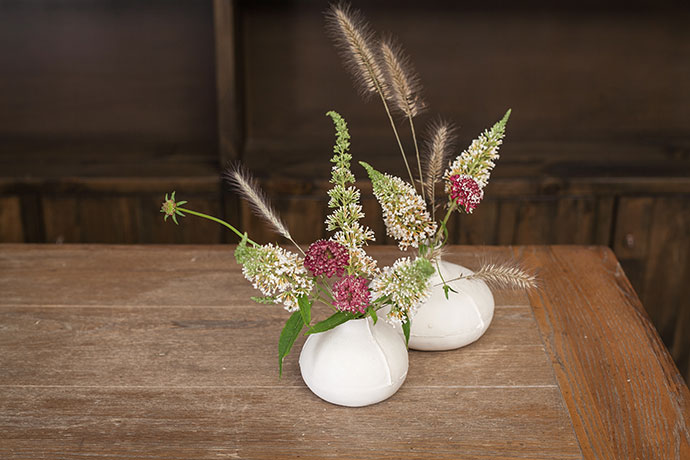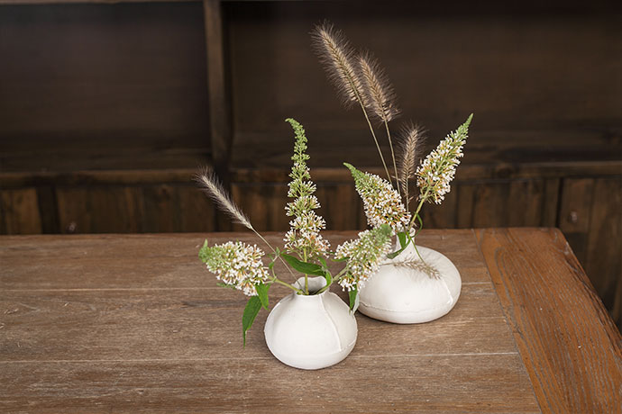 为了方便大家在花材搭配时的选择,花田小憩特设香味等级图谱,供大家在学习过程中了解更多植物的属性,以方便作品选择更适合的空间位置陈列。取两个白色花瓶,独特的扁圆造型,充满着浓郁的古风气息。