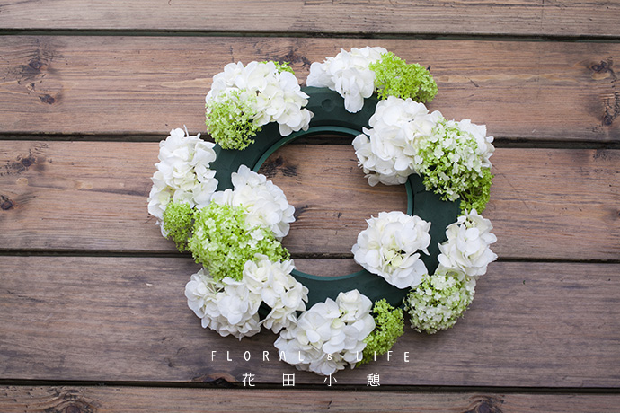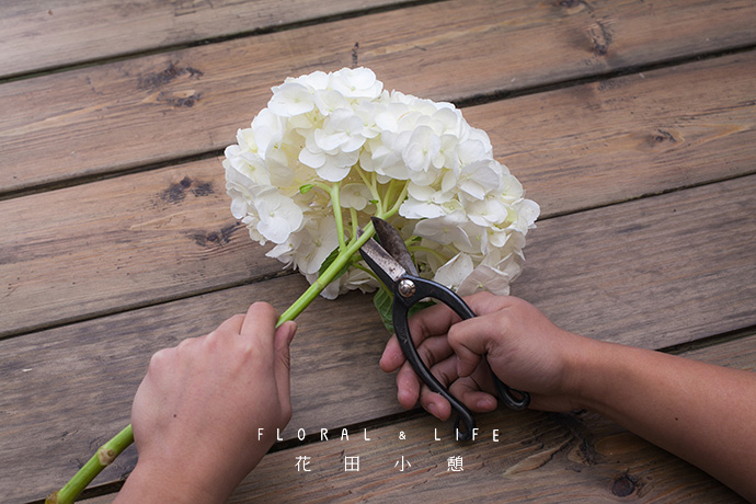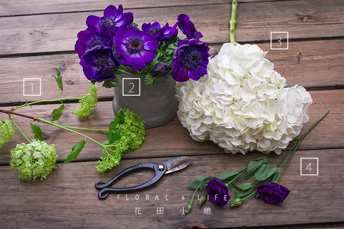 聚集式的插制手法,给人一种紧凑、密集的感觉,在视觉上保持动感。将绣球花与木绣球