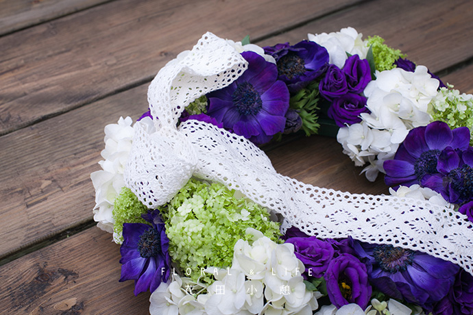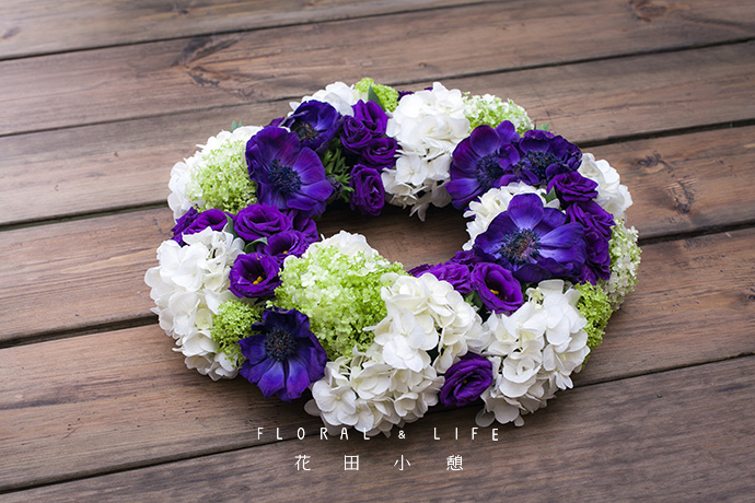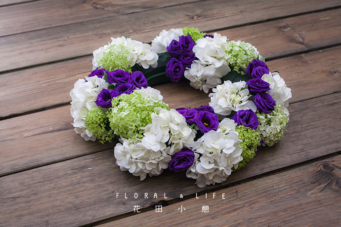 紫色是花艺创作时的常用色,是跨越冷暖的色彩,常用于作品的色彩调和及点缀。以洋桔梗作为亮色的表现,填充在四周较空的位置,可形成强烈的色彩对比。