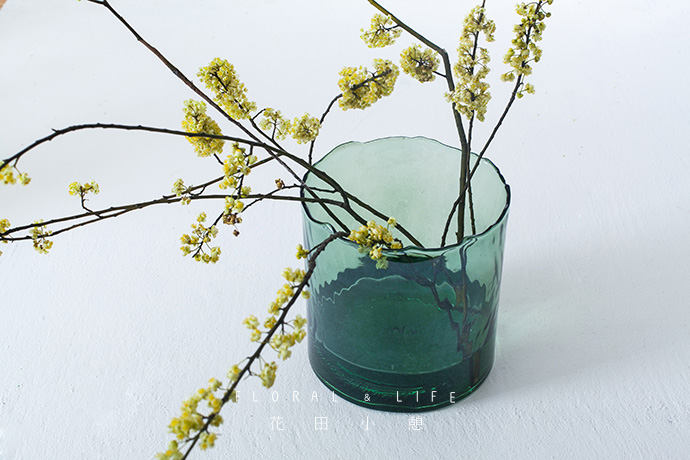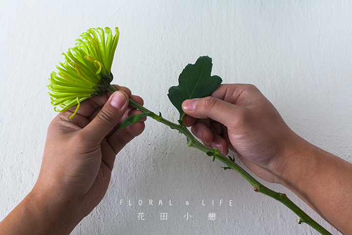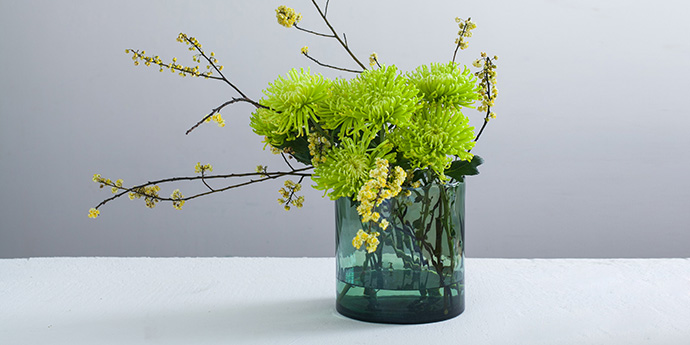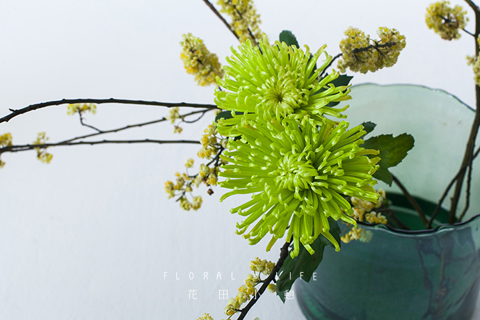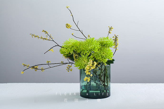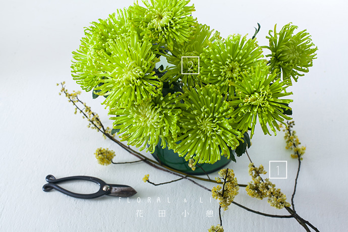 直立式的花材着重表现挺拔向上的生命感,将烟花菊直立插入花器中,然后于两侧再补入4-5支