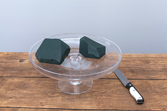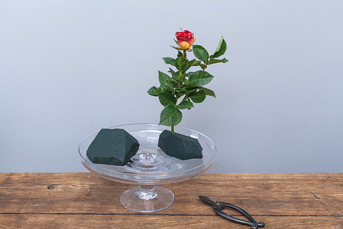 花田小憩气味图谱.准备一个适合的花器,加入花泥去棱角去边,大小两块花泥成“八”字状陈列.