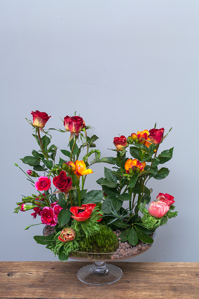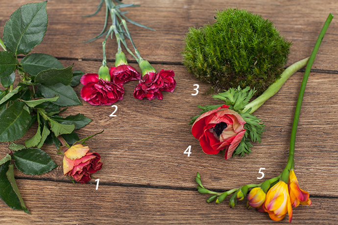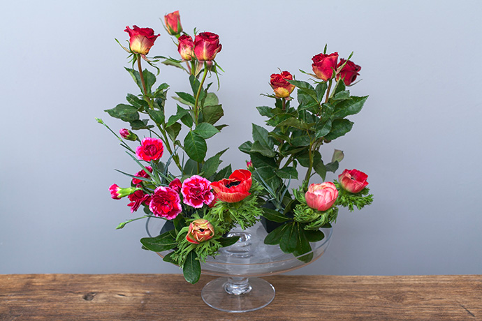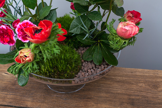 在造型按照花材的种类高低错落的加入康乃馨和银莲花,同时补上一些绿色的叶子遮盖花泥.