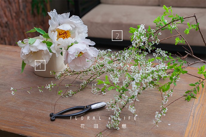 1.牡丹具有沉静淡雅的质感,插制于花器之中独有一种悠然若怅的情怀。通过精致小巧的雪柳进行点缀,让碎花落满庭院,成为生活中最为动人的色彩。