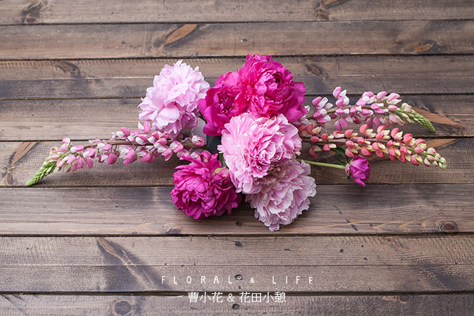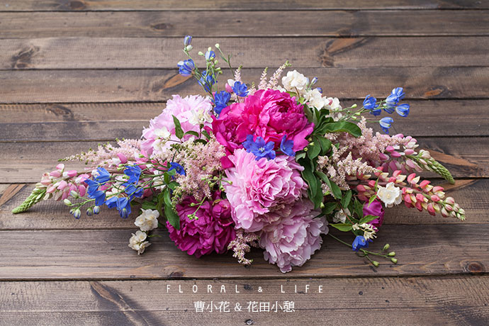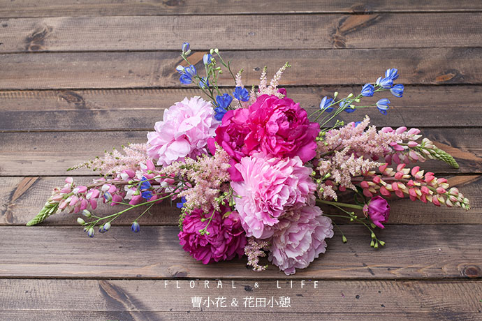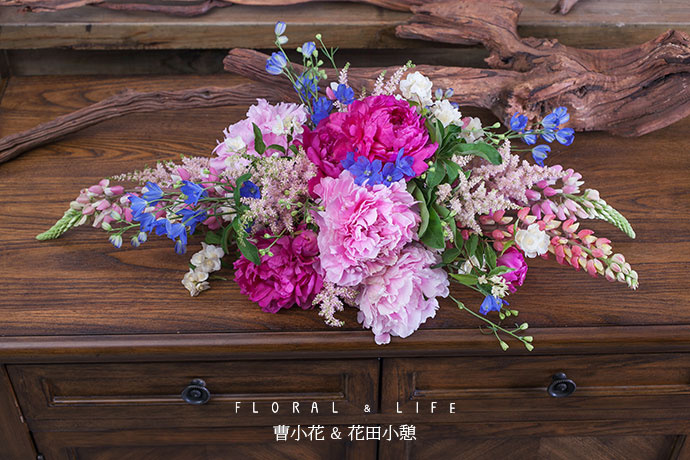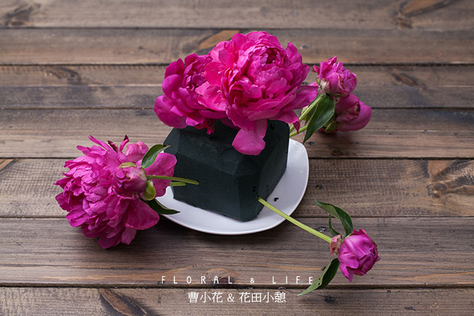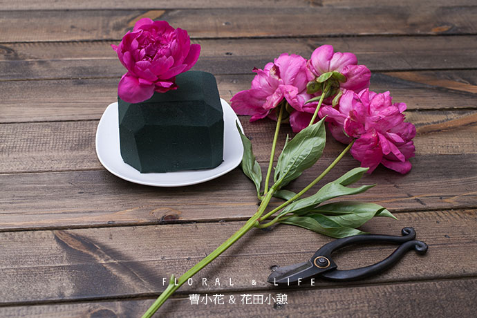 选取形体较好的芍药作为主花材,插制作于花泥中间略偏的位置作为造型的焦点.