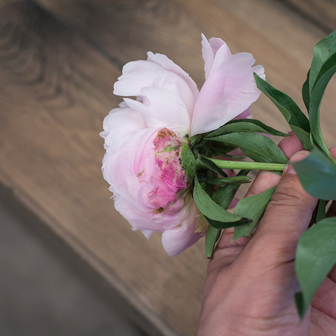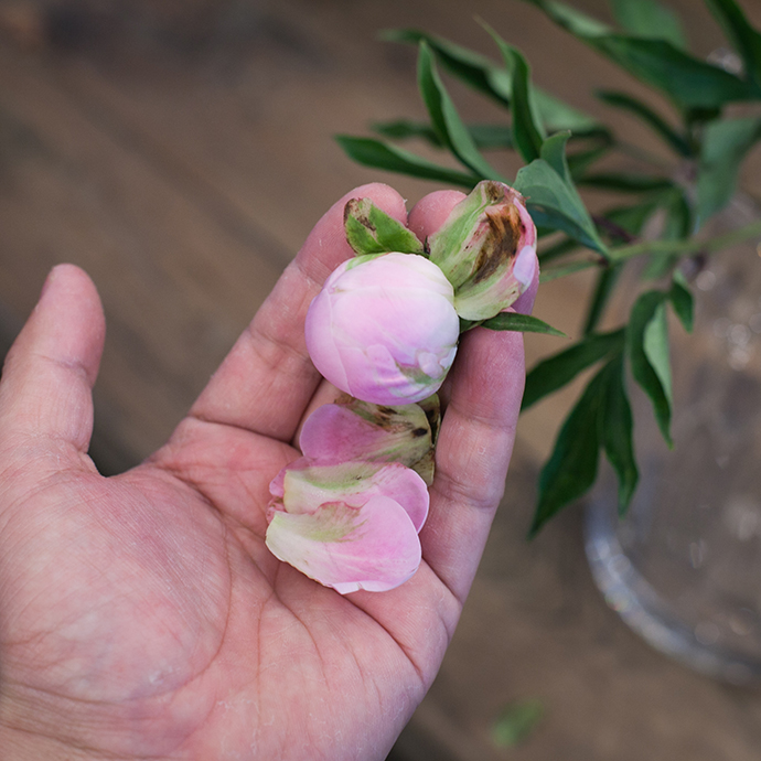 如果发现盛开的花朵已将外层的坏死花瓣挤到最下面,则无需去掉,它可以很好的将芍药托起塑形,如碗状为最佳。