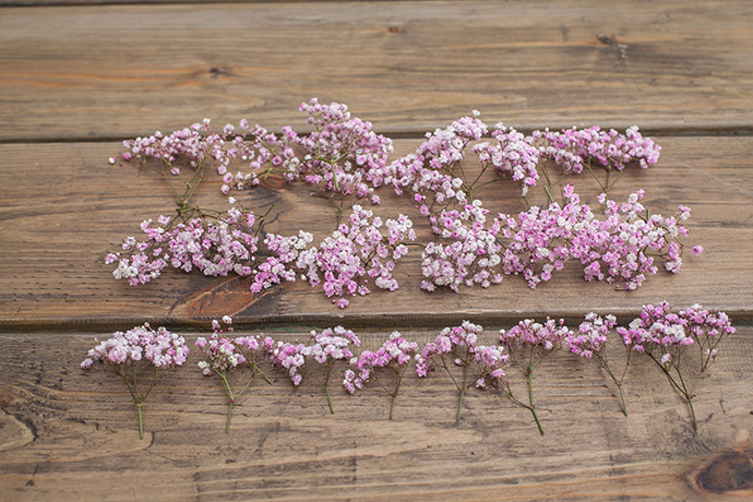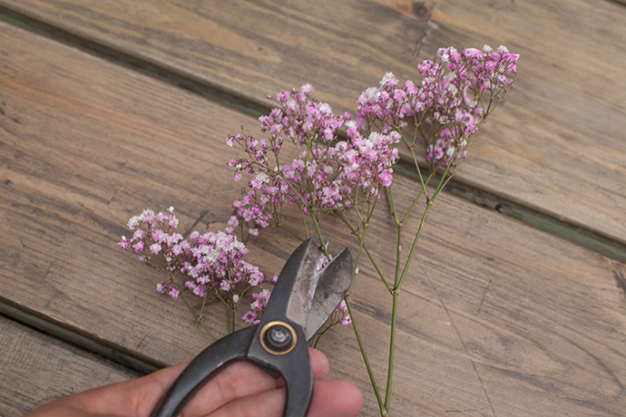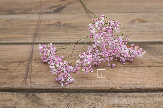 用铁丝将满天星花枝的根部进行缠绕,捆扎成一小束,同时保留根茎的适宜长度,以便于花材的补入。