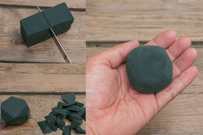 用插花刀将花泥切割成正方形形状,削掉其周边棱角分明的地方,使花泥趋向于圆球。